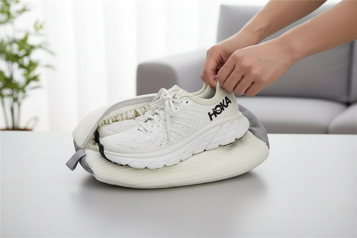 Legg skoene i posen, lukk glidelåsen, vask på 30–40°C, og la skoene lufttørke. Enkelt, trygt og rene resultater hver gang.